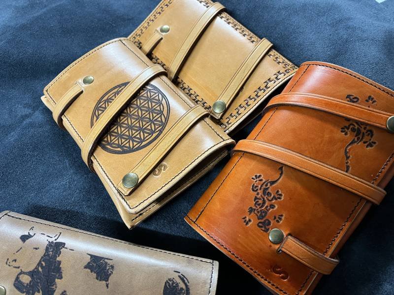 Tous les articles de maroquinerie sont personnalisables. Gravures sur cuir au laser ou repoussage entièrement exécuté a la main. Les besoins sont divers, les utilisations infinies et différentes. Je m’adapte à vos besoins et vos envies en fonction de votre projet. Je confectionne également des protections pour des couteaux, haches et des outils de travail en tout genre.